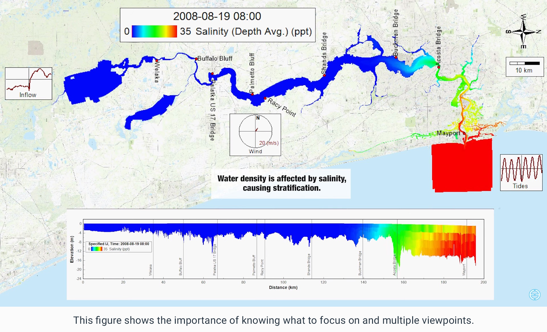 What is the focus? In a typical modeling study, multiple physical processes are simulated, and the model end point (eutrophication, flooding, oil spill, sediment erosion, etc.) is a function of these processes. It is important to recognize, though, that not all these processes may be useful or of interest to the audience. You may also lose your audience quickly if you pack in unnecessary information, so think about what is most important to this audience and focus on those processes.