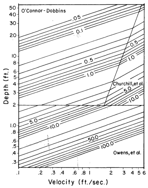 For a flowing system, the transfer coefficients are controlled by flow-induced turbulence. The film liquid phase transfer coefficient (KL, m/s) is then computed using the Covar method (Figure 1), in which the equation used varies with the velocity and depth of the cell. For cells with a depth less than 0.61 m (2 feet), the Owens formula (Eq. 1) is used to calculate. For segments with cell depth greater than 0.61 m and 4.08 the O’Connor-Dobbins formula (Eq. 2-1) is used. In all other cases, the Churchill formula (Eq. 3) is used to calculate the volatilization rate.