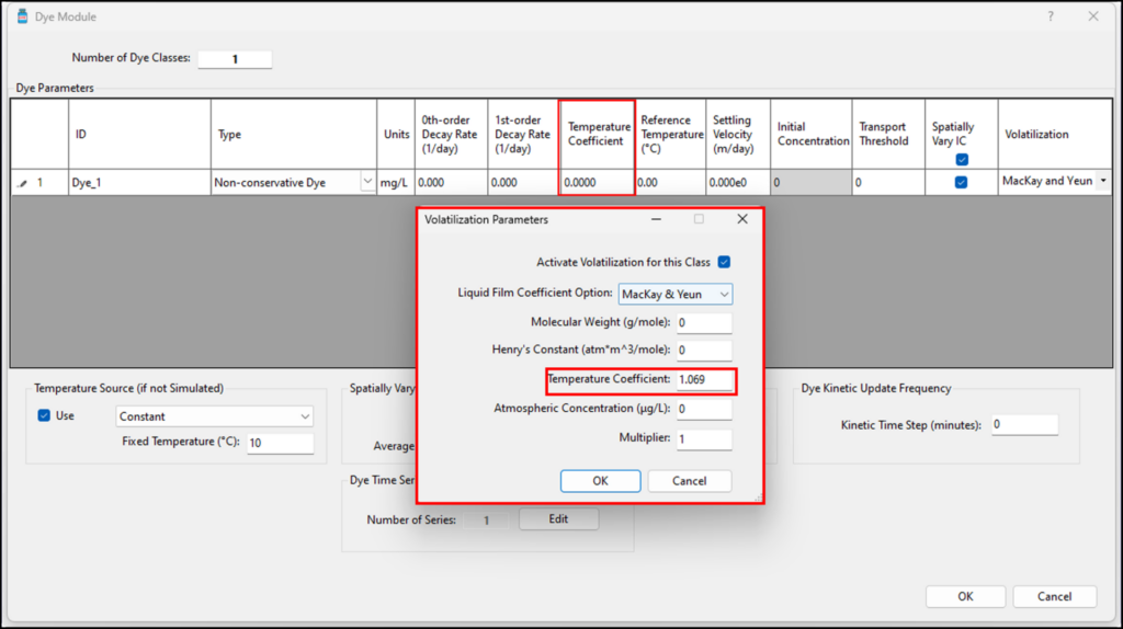 When simulating chemical fate and transport, volatile chemicals at the air-water interface frequently off-gas from the water into the atmosphere. The Chemical Fate module in EEMS is designed to work primarily in conjunction with the Sediment module, as the toxic substances sorb to sediments. In cases where sediment data is sparse or missing altogether, using a dye class as a proxy for the dissolved chemicals is recommended. To help users more accurately simulate this case, a volatilization component is required in the dye proxy.