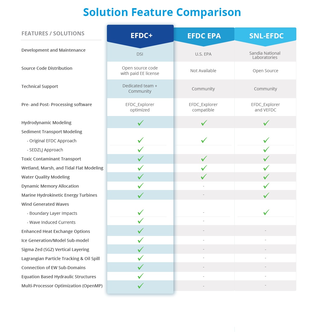 The DSI version of EFDC is called EFDC+ (formerly EFDC_DSI). EFDC+ is one of the most used versions of the EFDC model available to the scientific and engineering community. This article compares the capabilities of EFDC+ to other widely used EFDC models.