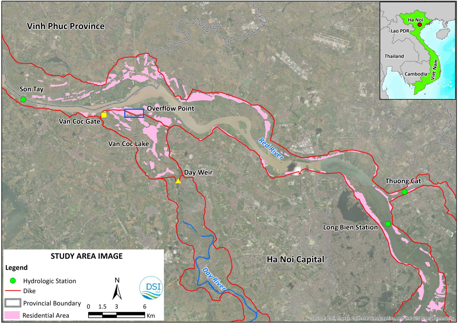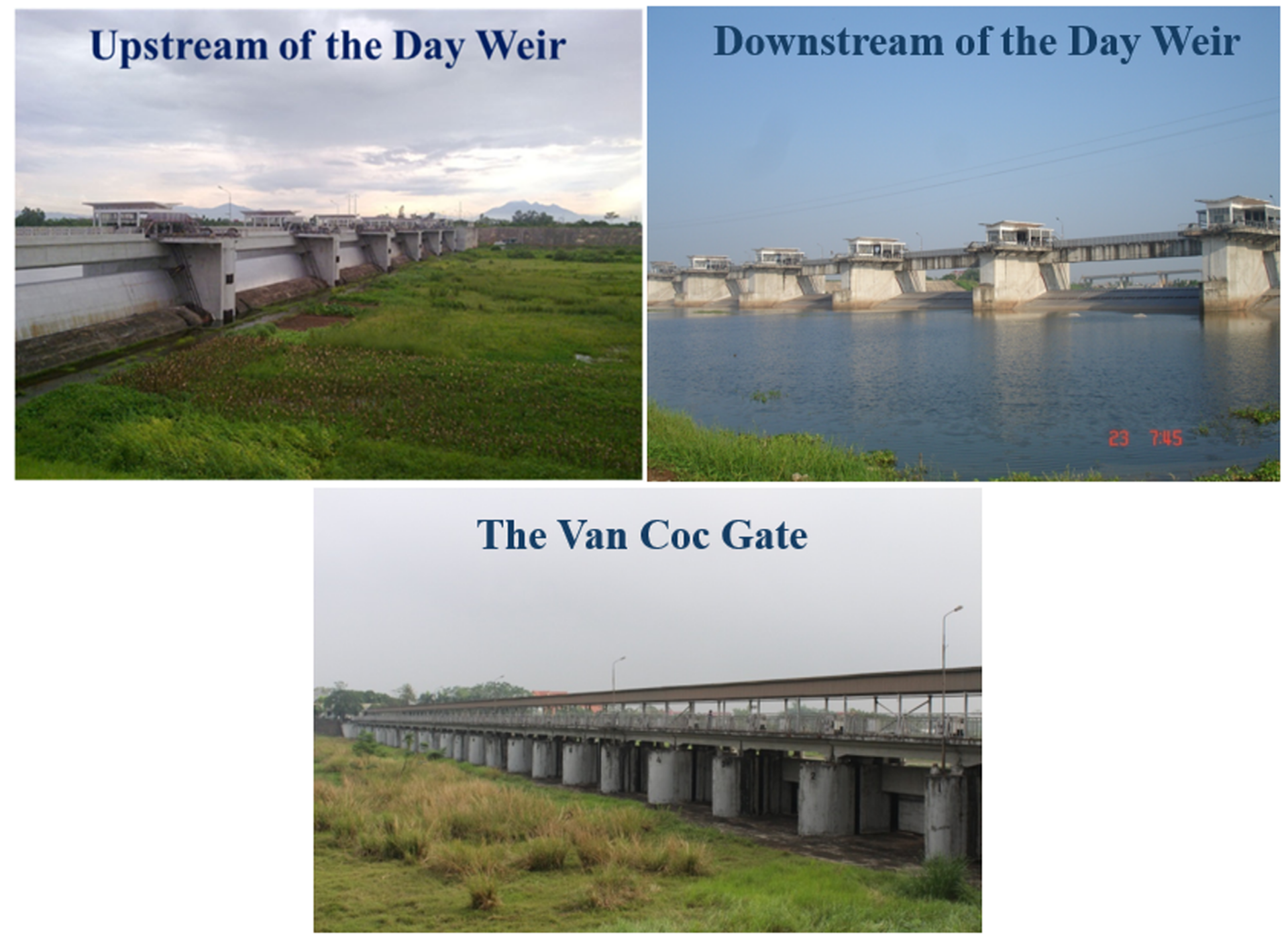 To protect Hanoi from flooding the Red River dike system was constructed centuries ago, and an emergency flood control solution has been in place since 1937. This solution involves discharging floodwater into Van Coc Lake, which serves as a regulating reservoir, through the Van Coc Gate and an overflow point located on the Red River bank. The water then drains into the Day River via the Day Weir. Photographs of the upstream and downstream of the Day Weir and Van Coc Gate are shown in Figure 3.