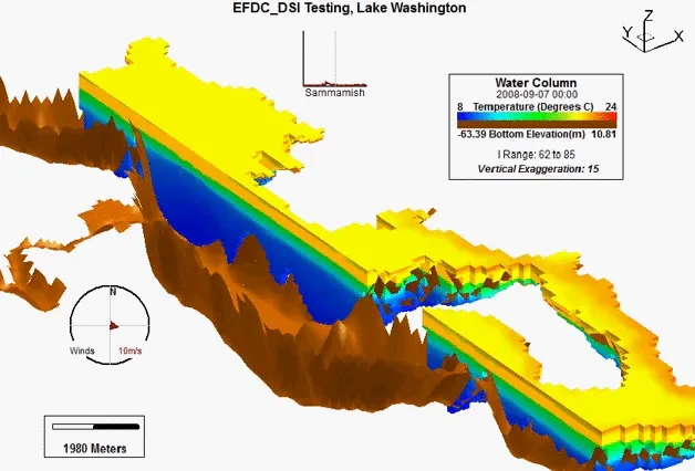 A paper using this example was presented at the 11th International Conference on Hydrodynamics (ICHD 2014), October 19 – 24, 2014, Singapore, and may be downloaded from this website (click here). This paper uses Lake Washington as a demonstration and verification of Sigma-Zed and EFDC+.