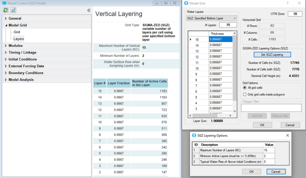 The Layers sub-menu serves as the focal point for summarizing the vertical layering within the grid. Right-clicking on this menu item unveils a set of options for configuring the vertical layering system, as illustrated in Figure 1. Users can choose between three fundamental options: Standard Sigma grid (SIG), Sigma-Zed (SGZ) Variable layers, or SGZ Uniform layers. In the Water Layers form, users can specify the number of layers and select the type of layering for their model.
