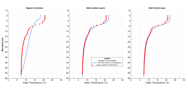 Notice that the Standard Sigma option produces poor vertical temperature stratification (Figure 3). Conversely, Figure 4 demonstrates that the temperature distribution under the SGZ option offers more accurate results. Additionally, using SGZ significantly reduces the total number of computational cells in the water column, reducing model running time.