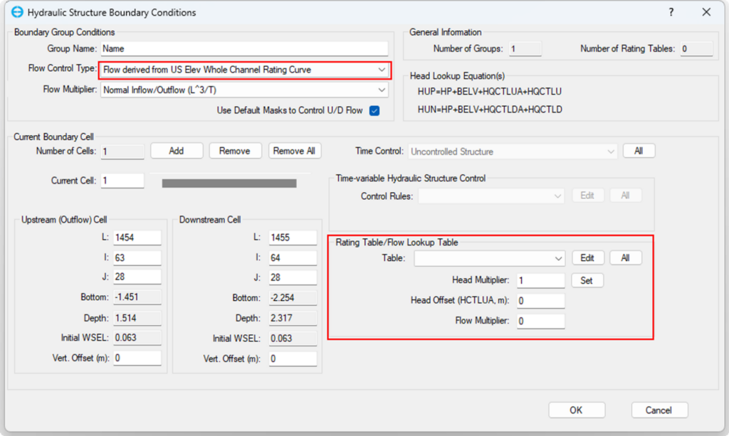A rating table or flow lookup table is used to determine the flow rate (discharge) of water based on a particular water surface elevation, selected via the Flow Control Type menu. For example, if Flow derived from US Elev Whole Channel Rating Curve is selected, EEMS allows setting a boundary using a single rating curve to represent the river. This option works like a flow table or time series, with an adjustable flow multiplier across different cells. A downstream cell for flow return can be set in the Downstream Cell frame. If left blank, EE ignores the downstream end. Additionally, the Head Multiplier, Head Offset, and Flow Multiplier must be specified, as shown in Figure 2.