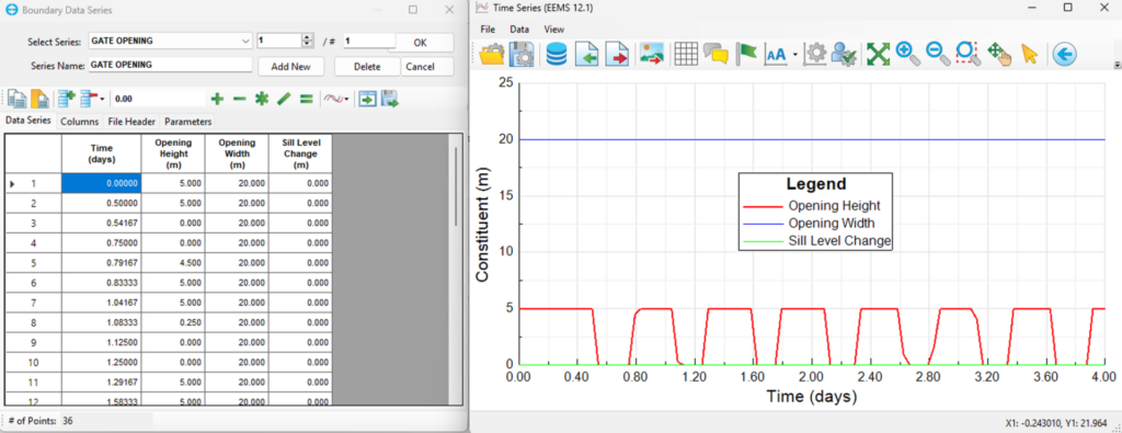 EEMS simplifies the configuration of hydraulic structures such as culverts, weirs, sluice gates, and orifices through equations. This option is selected by clicking “Flow Control Type” in the menu within the Hydraulic Structure Boundary Conditions form, for example, by selecting Sluice Gate as shown in Figure 4. Clicking on the Edit button in the Equation option will display the Hydraulic Structure form. The structure type is chosen using the Structure Type option. EEMS employs the corresponding equations for the chosen hydraulic structure. For example, when selecting a sluice gate, parameters such as sill elevation, height, width, super-critical discharge coefficient, sub-critical discharge flow, free flow coefficient, and submerged discharge coefficient must be set. Similarly, for other hydraulic structures such as culverts, orifices, sharp-crested weirs, and broad-crested weirs, corresponding coefficients such as Upstream/Downstream Elevation and structure length must be defined.