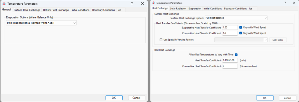 The Temperature Parameters setting window can still be accessed from RMC on the Temperature window under the Module drop-down menu. Figure 1 compares the Temperature Parameters forms in EEMS12.0 (left) with its equivalent in EEMS12.1 (right). While Initial Conditions, Boundary Conditions, and the Ice configuration forms are preserved, Surface and Bottom Heat Exchange forms have been combined and lumped into the single Heat Exchange form in EEMS12.1. In addition, the General tab for Evaporation model selection has been changed to the Evaporation tab, and a new tab added for Solar Radiation configuration. The properties of each modified tab are detailed in the following sections.