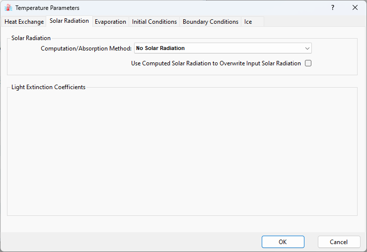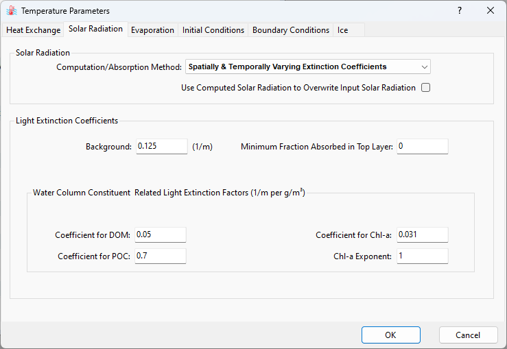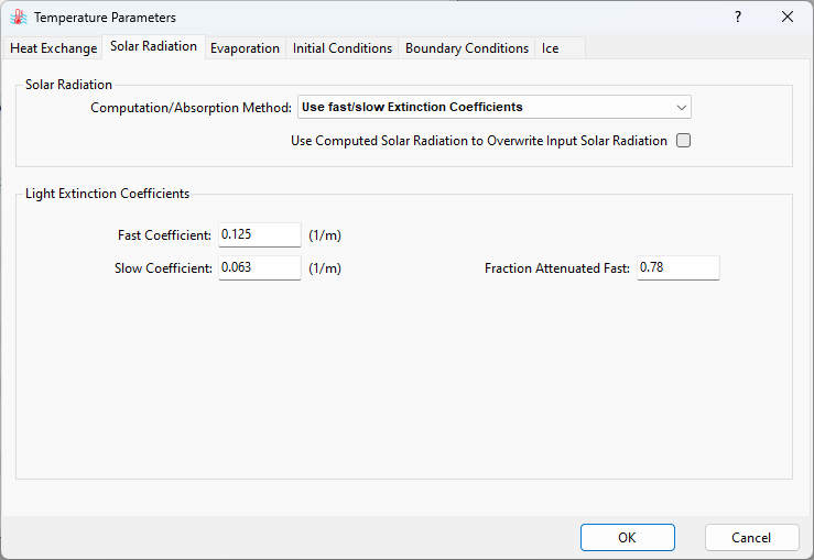 If the No Solar Radiation method is selected, heat fluxes coming from the solar radiation are excluded from the model. If the Absorb 100% Solar Radiation in Surface Layer method is selected, heat fluxes coming from solar radiation are preserved without spatial and temporal attenuation. The third option, Use fast/slow Extinction Coefficients, considers the reduction (absorption) of light intensity within the water column, which is governed by fast and slow light extinction coefficients (Figure 6). The last option, Spatially & Temporally Varying Extinction Coefficients, computes the solar radiation when the light attenuation is temporally and spatially influenced by water quality component concentrations (Figure 7). This approach is advisable when the water quality is simulated.