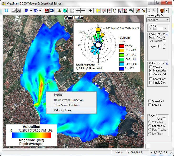 Did you know that EFDC+ Explorer has a Velocity Rose feature? This feature allows the user to view the speed and direction distribution of a given cell over a user defined period of time. To plot the velocity rose the Velocities viewing option should be selected in the ViewPlan. The user can then select the cell of interest with a right mouse click and select the Velocity Rose option. This tool is available for all layers as well as depth averaged, and displays a rose as shown below. The location of the cell being displayed is shown in the bottom left hand corner of the form.